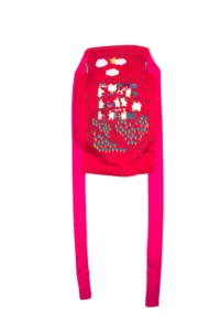 Designing Motherhood is conceived by a team of design curators and scholars including Juliana Rowan Barton, Michelle Millar Fisher, and Amber Winick; artist and arts administrator Zoë Greggs; and advisors from the Maternity Care Coalition in Philadelphia. It was first exhibited at the Mütter Museum and the Center for Architecture and Design in 2021 before traveling to venues in Boston, Seattle, and Stockholm. Now in its fifth iteration, the HCCC’s adaptation is unique in its focus on the relationship between caregiving and craftwork. The exhibition opens with a textile-rich installation that explores vessels of life and care: from baby carriers and blankets to the body itself. Curtains of varying pink shades encircle the walls, visually conjuring a womb or hospital room. One may recognize a suspended and neatly folded white cotton textile with alternating blue and pink stripes as the ubiquitous Kuddle-Up Blanket. Created during the mid-century in concert with the developing medical garments industry, it is the hallmark receiving blanket in hospitals today. Included, too, is the Snugli (the first mass-produced baby carrier in the US), which exploded in popularity in the 1960s due to its convenience, comfort, and hands-free design.