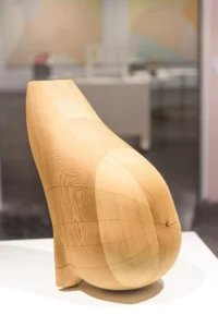 Emerson Croft’s Earth Baby Blanket (2021) shows how the handmade can intervene in the social apparatus of industrial design. The complexity of weave and nuances of green and gray in Croft’s textile represent a deeper intricacy of our social and cultural fabric that challenge conventions of gender encoded in the rigid colored striping of the Kuddle-Up Blanket. Indigenous baby carriers feature as well, including Sue Rigdon’s Cradleboard (1995), Tanya White’s photograph of a wahakura (2022), and Ger Xiong/Ntxawg Xyooj’s daim nyias (2021). Each demonstrates the diversity and ingenuity of Indigenous design histories while highlighting traditional craft technologies. In My Belly (2021) from the series My Black Body by Alison Croney Moses, the exposed disjointed seams, contrasting grains and progressive tones of wood express the physical and spiritual shape-shifting that occurs through pregnancy. Poetically rendered in cedarwood and milk paint, motherhood is made metamorphic like the wood she wields.